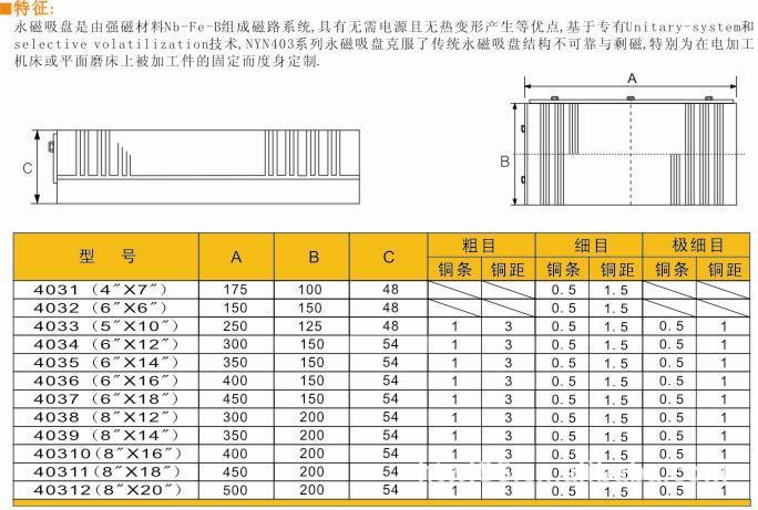 适用于一般平面磨床及放电加工机使用; 开关ON/OFF转换时,磁盘表面的精度不会改变; 磁极间隔细密,磁力分布均匀,适合较小的工件或细的薄板加工; 使用高性能磁台,磁性强,残余磁性少; 精度度高变化小,符合高精度加工作业; 拖动磁力,平均13kgf的磁性吸引力;